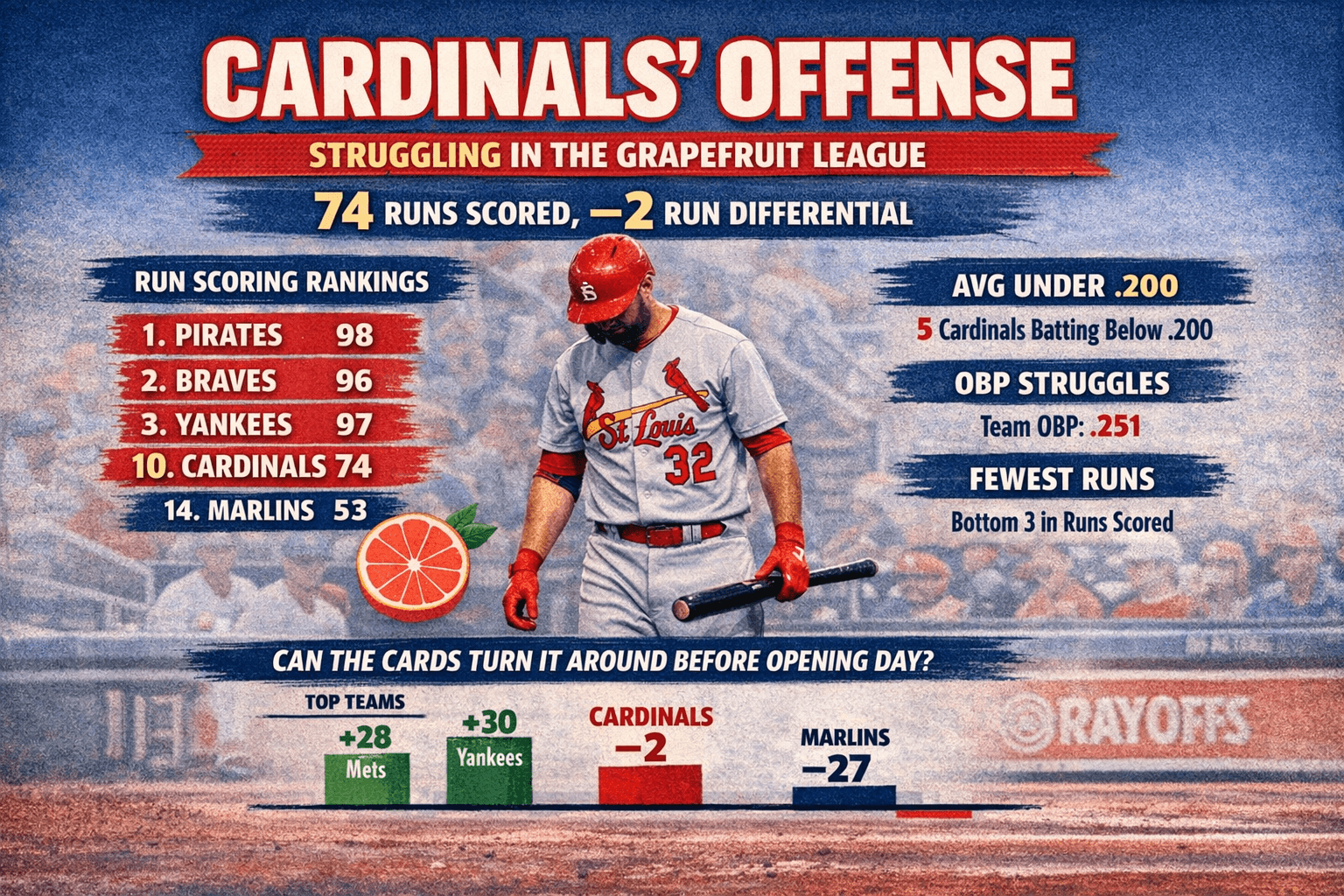 Still, the early pattern is difficult to ignore. The Cardinals’ offense has yet to find its footing, and compared with the rest of the Grapefruit League, the production gap is noticeable.